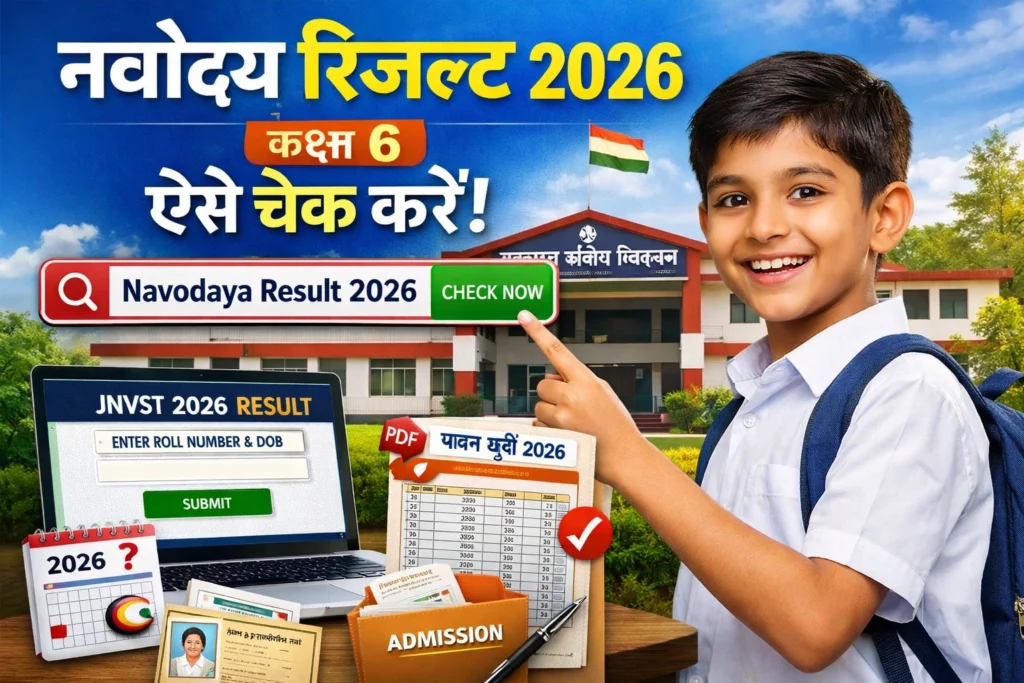 Navodaya Result 2026 Class 6 लाखों छात्रों और उनके अभिभावकों के लिए एक बहुत महत्वपूर्ण अपडेट होता है। हर साल भारत के अलग-अलग राज्यों से लाखों विद्यार्थी Jawahar Navodaya Vidyalaya Selection Test (JNVST) में भाग लेते हैं, ताकि उन्हें जवाहर नवोदय विद्यालय (JNV) में कक्षा 6 में प्रवेश मिल सके।